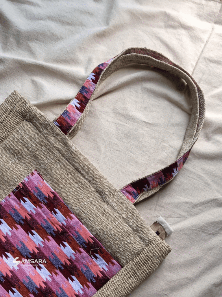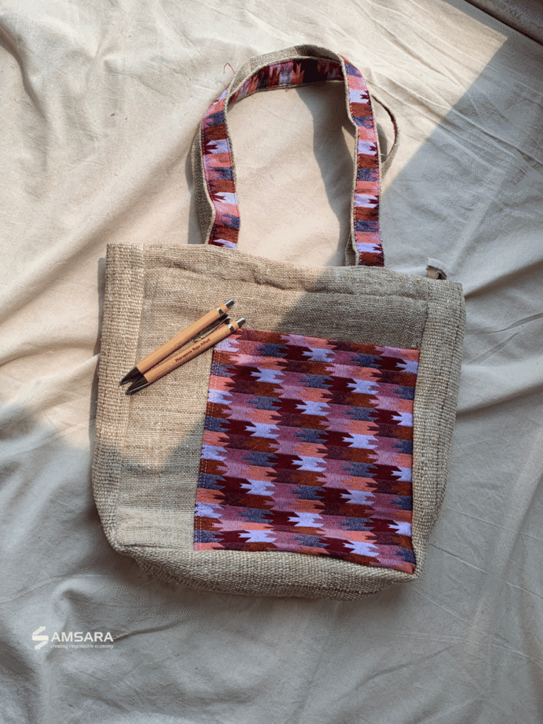 Designer Hemp Tote – A sustainable and authentic tote bag that carries both functionality and cultural significance. Made from durable hemp and accented with Nepali Dhaka fabric, it features multi-pockets, a padded compartment, an outer Dhaka pocket with button, and a Dhaka strap—perfect for daily use, events, or eco-conscious gifting.