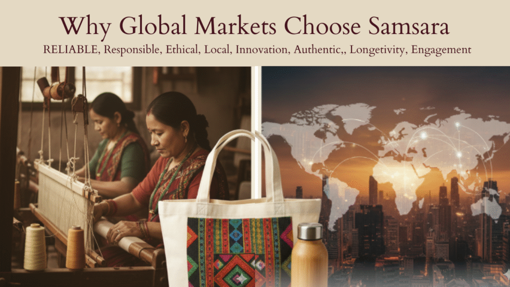 Samsara has over 90% of our products manufactured locally in Nepal, specializing in blending traditional materials, such as Lokta paper and Dhaka fabric, with modern, functional designs. This combination of local sourcing with worldwide usability reflects the level of comfort that products will find in international markets – whether it’s an eco-aware European conference or a corporate conference in Asia.